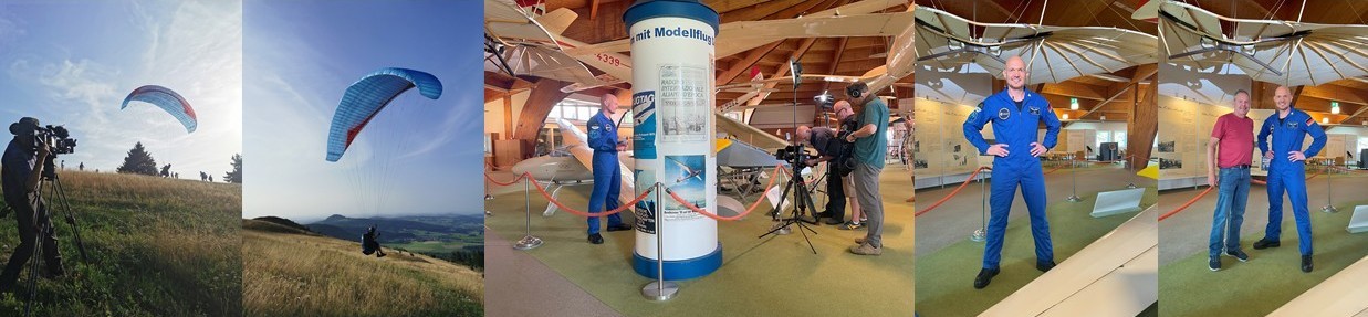 Zuerst flog Alexander Gerst mit einem Gleitschirm an der Abtsrodaer Kuppe, dabei wurde er von einem Tandemschirm mit Andreas Schubert und Frau Vogel vom Drehteam in der Luft begleitet und gefilmt. Anschließend gab es dann zwei Moderationen von Alexander Gerst unter unserem Lilienthal-Normal-Apparat im Rundbau des Museums.